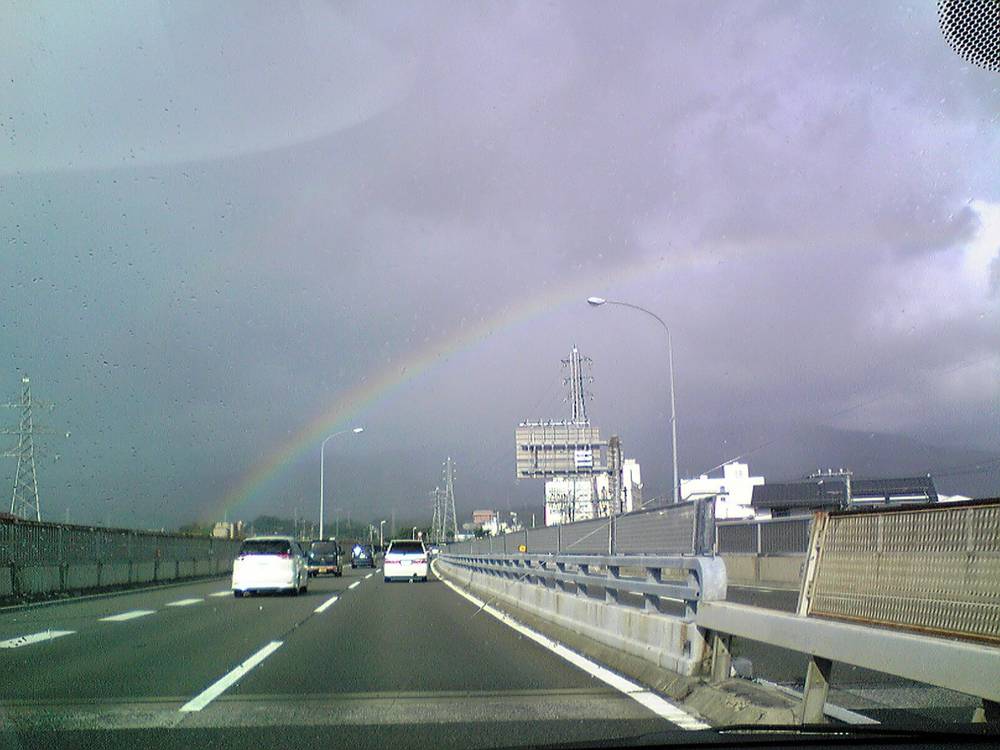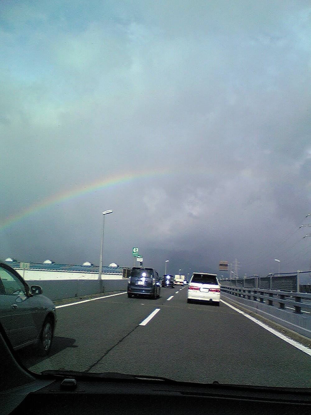 車で移動中,虹が見えた.なんか進行方向すごい曇っているんですけど….